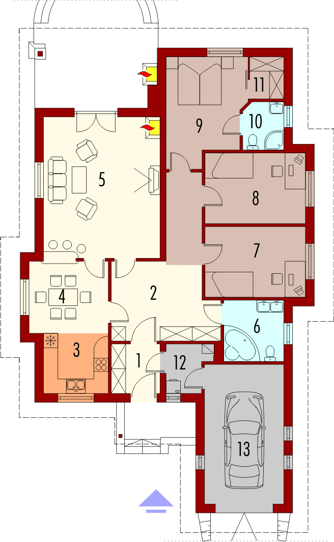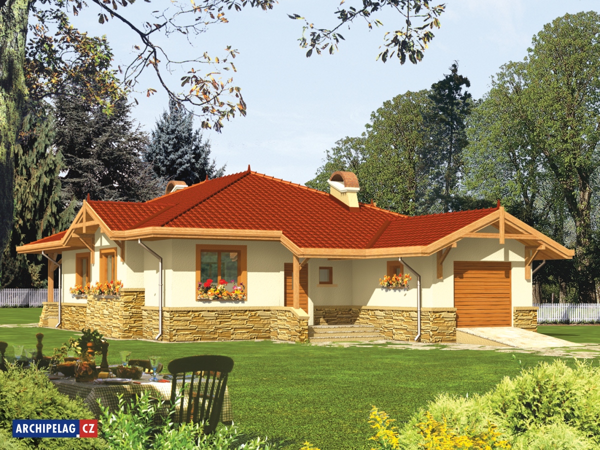 Přízemní rodinný dům, nepodsklepený, s vestavěnou garáží, určený pro 4 člennou rodinu. Denní část tvoří hala, kuchyň, jídelna a obývací pokoj. Noční část tvoří tři ložnice, z nichž jedna má vlastní koupelnu, dále pak společná koupelna snadno přístupná i z denní části domu. V obývacím pokoji se počítá se vstupem na zastřešenou terasu. Z tohoto důvodu je v něm navržený také oboustranný krb.