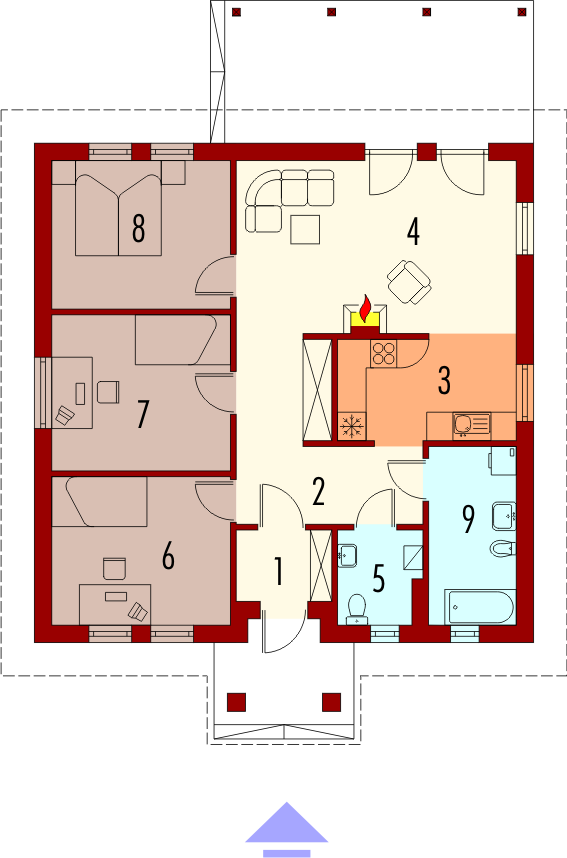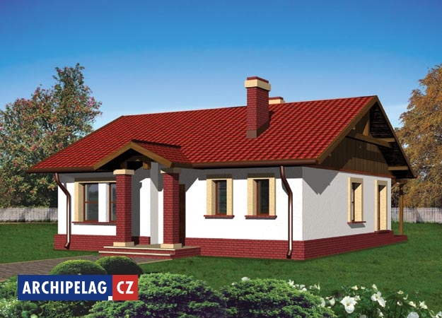 Přízemní rodinný dům bez užitného podkroví, nepodsklepený, určený pro 4-5 člennou rodinu. Uvnitř domu nejsou žádné nosné stěny, což nám dovoluje libovolné uspořádání prostoru. Přístup na půdu je zajištěn pomocí skládacího schodiště. Tento prostor můžeme využívat jako malý sklad. Projekt tohoto rodinného domu je dostupný ve dvou verzích. Liší se umístěním hřebene střechy – okap nebo štít střechy na čelní straně.