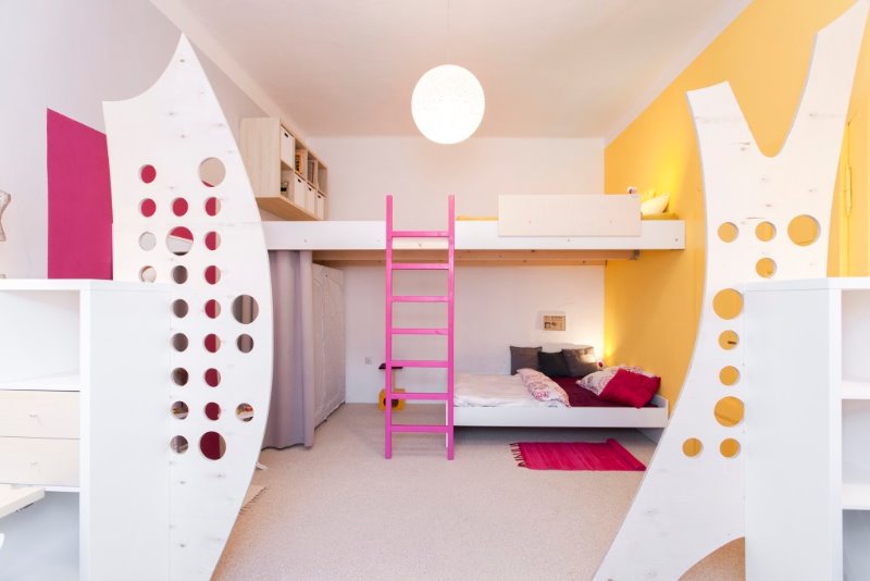 Nakonec jsme zvládli zrealizovat oba pokoje, jinak by to byla doslova Sophiina volba, vybrat buď jen kuchyň pro babičku, nebo jen pokoj pro holky. Styl kuchyně s obývákem je lehce venkovský, přiměřený věku babičky, avšak doplněný výraznou moderní barvou, přeci jen tam žijí i dvě mladé slečny. Zajímavý prvek, který se objevuje v obou místnostech, je překližková deska, vyřezaná do geometrického oblouku, perforována otvory. V kuchyni slouží jako podpěra barové desce, v pokojích jako oddělení učícího zákoutí s psacími stoly. Vzhledem k tomu, že absolutně nečekali, že dostanou oba pokoje, ocení právě rozsah odvedené práce. Holky stoprocentně nadchne polopatro, každá má své důstojné soukromí.“